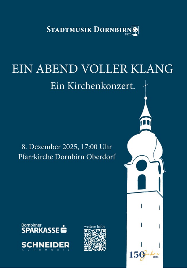 Die Stadtmusik Dornbirn lädt herzlich ein zum Kirchenkonzert am Sonntag, den 8. Dezember 2025 um 17:00 Uhr in der Pfarrkirche Oberdorf.